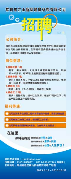 常州市江山新型建筑材料有限公司主要生產(chǎn)經(jīng)營(yíng)高端新型砂加氣砌塊磚和板材,公司擁有國(guó)內(nèi)^先進(jìn)的生產(chǎn)流水線,二期項(xiàng)目已開始進(jìn)入實(shí)施階段。因發(fā)展需要,誠(chéng)聘: 1. 營(yíng)銷主管1名,要求:男女不限,大專以上或營(yíng)銷專業(yè)畢業(yè),年齡35~45周歲,有5年以上的新型建材銷售管理經(jīng)驗(yàn); 2. 銷售專員7名,要求:男女不限,中專以上或者營(yíng)銷專業(yè)類畢業(yè),年齡30~40周歲,有建材類銷售經(jīng)驗(yàn)優(yōu)先; 3. 物檢員1名,要求:男性,25~30周歲,高中以上學(xué)歷; 4. 操作工17名,要求:男性優(yōu)先,初中以上學(xué)歷,年齡47周歲以下,有生產(chǎn)型企業(yè)工作經(jīng)驗(yàn)優(yōu)先。 ◆ 公司免費(fèi)提供設(shè)施完善的住宿 ◆ 公司員工食堂寬敞明亮 ◆ 詳情咨詢:蔣經(jīng)理13151285857 88666716 招聘信息:www.rosemmg.com/recruitment.asp 橫山橋鎮(zhèn)芳茂村亞能電廠1號(hào)門對(duì)面 常州市江山新型建筑材料有限公司 2015年9月5日 |