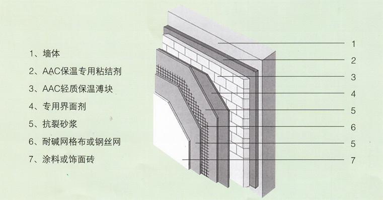 AAC建筑保溫系統(tǒng)是指通過(guò)外貼或內(nèi)貼江山AAC輕質(zhì)保溫薄塊及各種配套輔助材料,解決建筑物墻體、屋面保溫的整套處理方案。該系統(tǒng)組成示意圖如下: